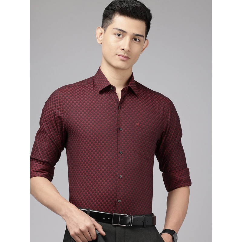 Maroon and black textured self design opaque formal shirt, has a spread collar, button placket, 1 patch pocket, long regular sleeves, curved hemMATERIAL & CARE100% CottonMachine washSIZE & FITBrand Fit: Manhattan Fit: Slim Fit The model (height 6') is wear